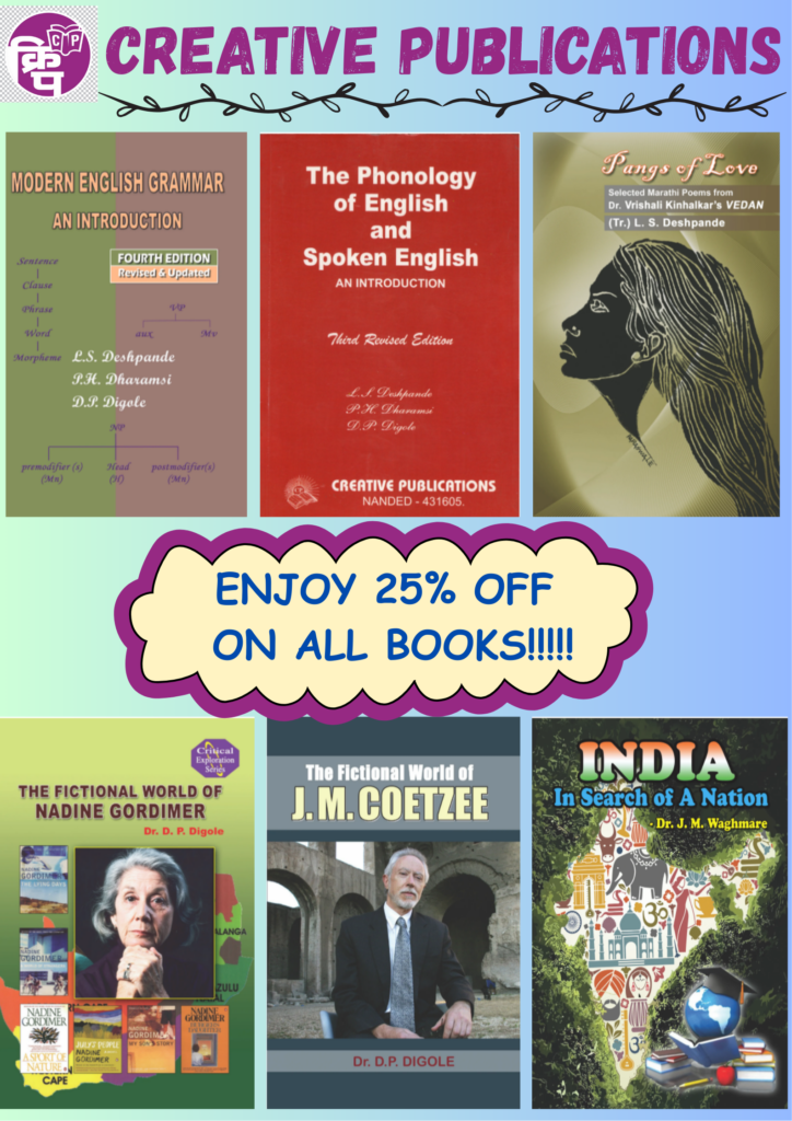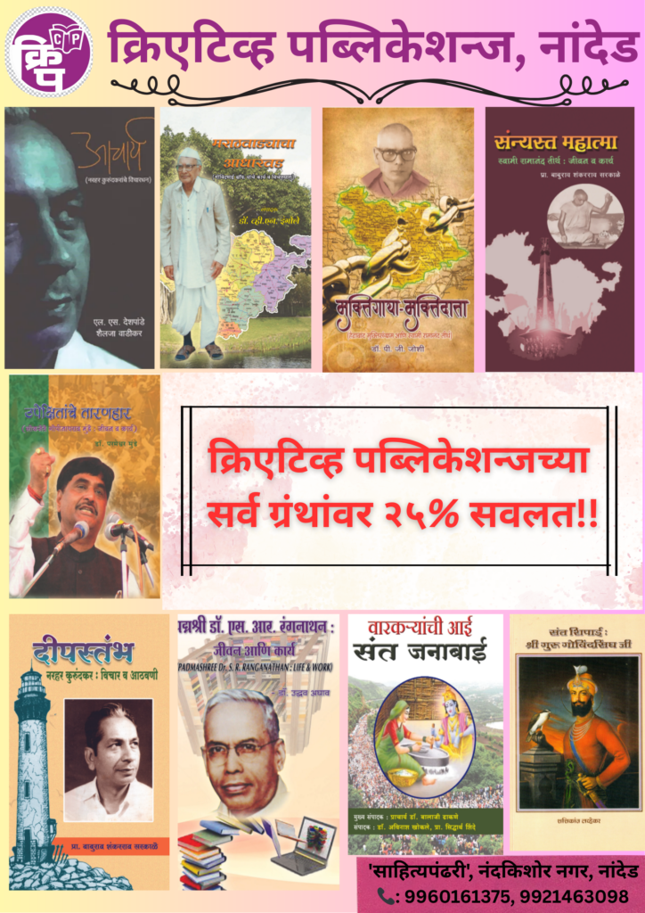 मराठी, हिंदी व इंग्रजी भाषेतील दर्जेदार ग्रंथांचे प्रकाशन करणारी नामांकित संस्था..’क्रिएटिव्ह’ नेहमी ‘क्वानटिटी’ पेक्षा ‘क्वालिटी’ वर भर देते. Special Offer 20% Discount on all Books